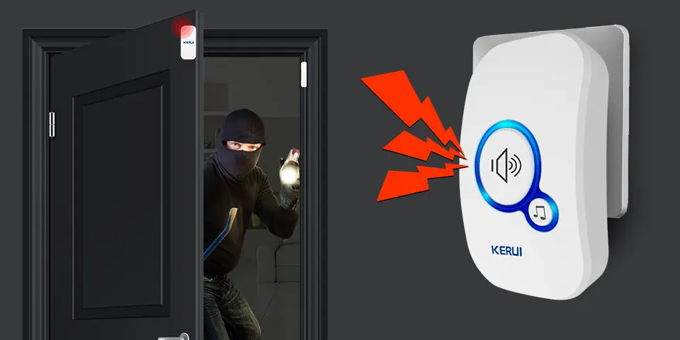 Install the door sensor on the door or window. When someone pushes to open the door or window, the doorbell will receive the signal and alarm.