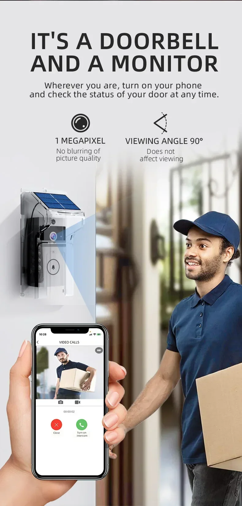 * Environmentally friendly & solar energy: Our solar video doorbell makes full use of solar energy, and you can enjoy 24/7 continuous monitoring without wiring or changing batteries. Environmentally friendly and affordable, it is ideal for sustainable homes.